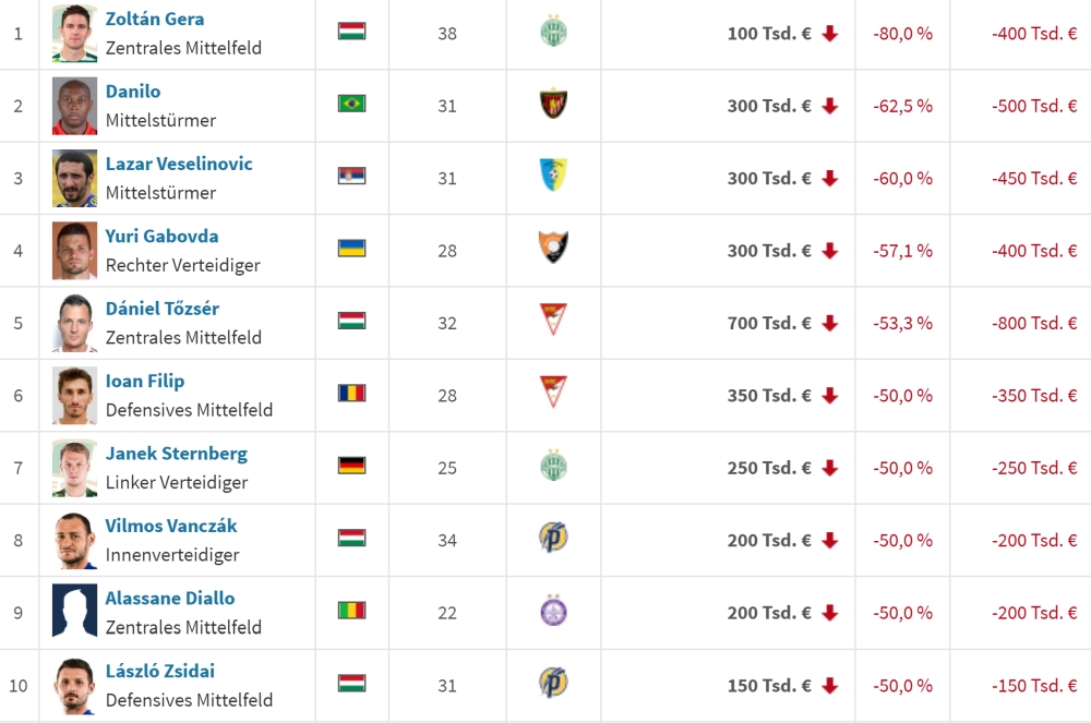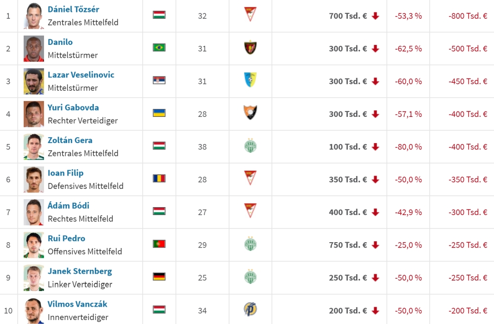 A Transfermarkt ezúttal is felmérte azt is, hogy mely futballisták értéke zuhant a leginkább 2017 januárja óta. Itt a DVSC csapatkapitánya, a korábbi magyar válogatott áll az "élen", Tőzsér Dániel 800 ezer euróval (mintegy 246 millió forinttal) ér kevesebbet, mint egy éve. A Honvéd brazilját, a nyáron visszatért Danilót 500, a Mezőkövesd szerb csatárát, Lazar Veselinovicot pedig 400 ezerrel taksálják kevesebbre a németek.