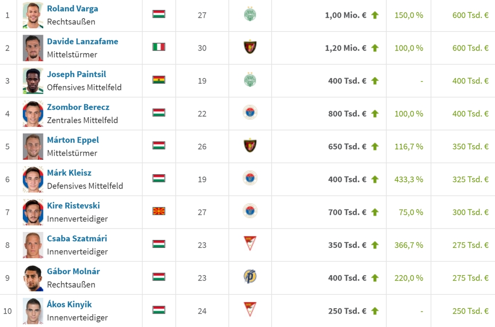 Varga Roland értéke 600 ezer euróval növekedett az elmúlt 12 hónapban a németek szerint, jelenleg hozzávetőlegesen 1 millió euróra taksálják a Fradi válogatott szélsőjét. Ugyancsak ugyanígy, azaz jelentősen növekedett a bajnoki címvédő Honvéd olasz csatárának, Davide Lanzafaménak a piaci ára, 600 ezerről 1,2 millióra lépett a légiós. A Ferencváros nyári igazolása és az ősz egyik legjobbja, a ghánai Joseph Paintsil 400 ezer euróval növelte értékét.