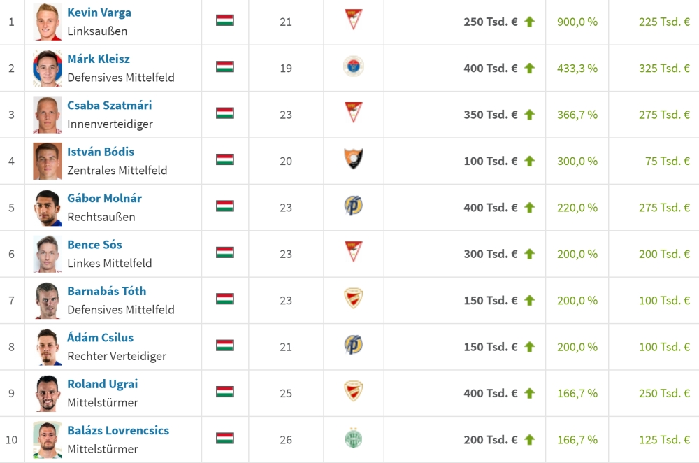 Ami a százalékos növekedést illeti, Varga Kevin, az idény egyik felfedezettje 900 százalékos(!) ugrást produkált, 25 ezerről 250 ezer euróra nőtt a Loki-támadó ára a portál szerint. Jelentősen nőtt Kleisz Márk értéke is, ami azért is nagy szó, mert a Vasas több poszton is bevethető, mindössze 19 éves utánpótlás-válogatott játékosa hosszabb ideje sérüléssel bajlódik. Így is 75 ezer euróról 400 euróra növelte a képzeletbeli árcéduláján olvasható számot a tehetség (433%). Egy másik debreceni futballista, a védőként bevethető Szatmári Csaba egy 366,7 százalékos lépést tett meg 12 hónap alatt.