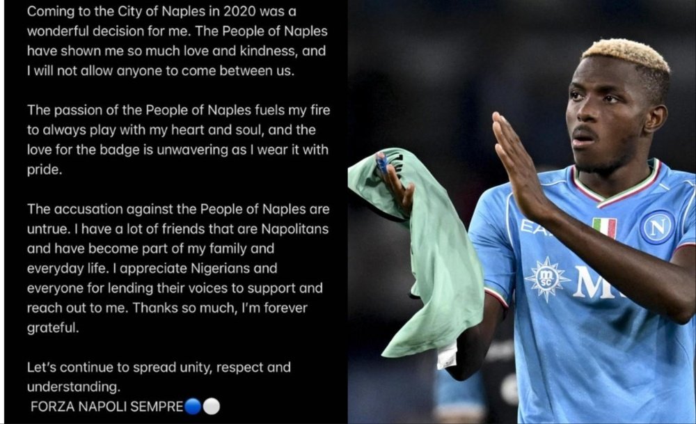 Napoli: Victor Osimhen egy meglehetősen érzelmes nyilatkozatot adott ki, miután klubja, a Napoli egy látszólag rajta gúnyolódó videót rakott ki a közösségi felületein. A posztja azután született meg, hogy Alessio Fortino, a Napoli közösségi médiájáért felelős vezetője lemondott. "2020-ban Nápoly városába jönnöm egy csodálatos döntés volt a részemről. A nápolyiak annyi szeretetet és kedvességet mutattak nekem, és nem engedem, hogy bárki közénk álljon. A nápolyiak szenvedélye táplálja a tüzet, hogy mindig szívvel-lélekkel játsszak, a klubcímer iránti szeretetem pedig rendíthetetlen, büszkén viselem a csapat színeit. A nápolyiak elleni vádak nem igazak. Sok barátom van, akik nápolyiak, és a családom, illetve a mindennapi életem részévé váltak. Nagyra értékelem a nigériaiakat és mindenkit, aki a hangját hallatta, hogy támogasson engem. Örökké hálás leszek. De támogassuk az egységet, a tiszteletet és a megértést. FORZA NAPOLI SEMPRE" - írta a csatár.