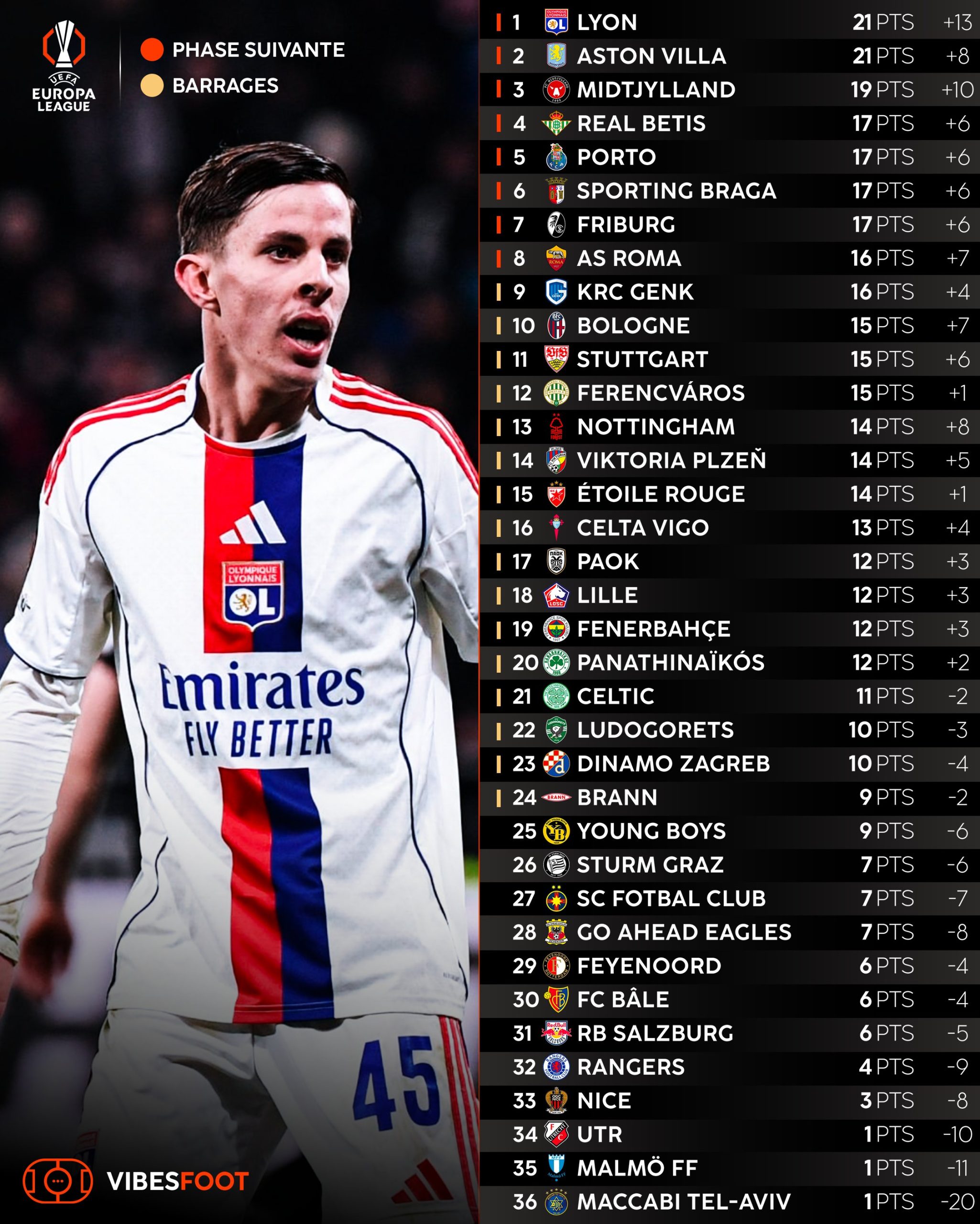 A francia együttes mellett a csak rosszabb gólkülönbségével a második helyre szoruló Aston Villa, valamint a Midtjylland, a Real Betis, a Porto, a Braga, a Freiburg, valamint az AS Roma végzett még a legjobb nyolcban, így ezek az együttesek egyből nyolcaddöntőbe jutottak, míg a 9-24. helyen zárt kluboknak játszaniuk kell ezért egy oda-visszavágós párharcot februárban.