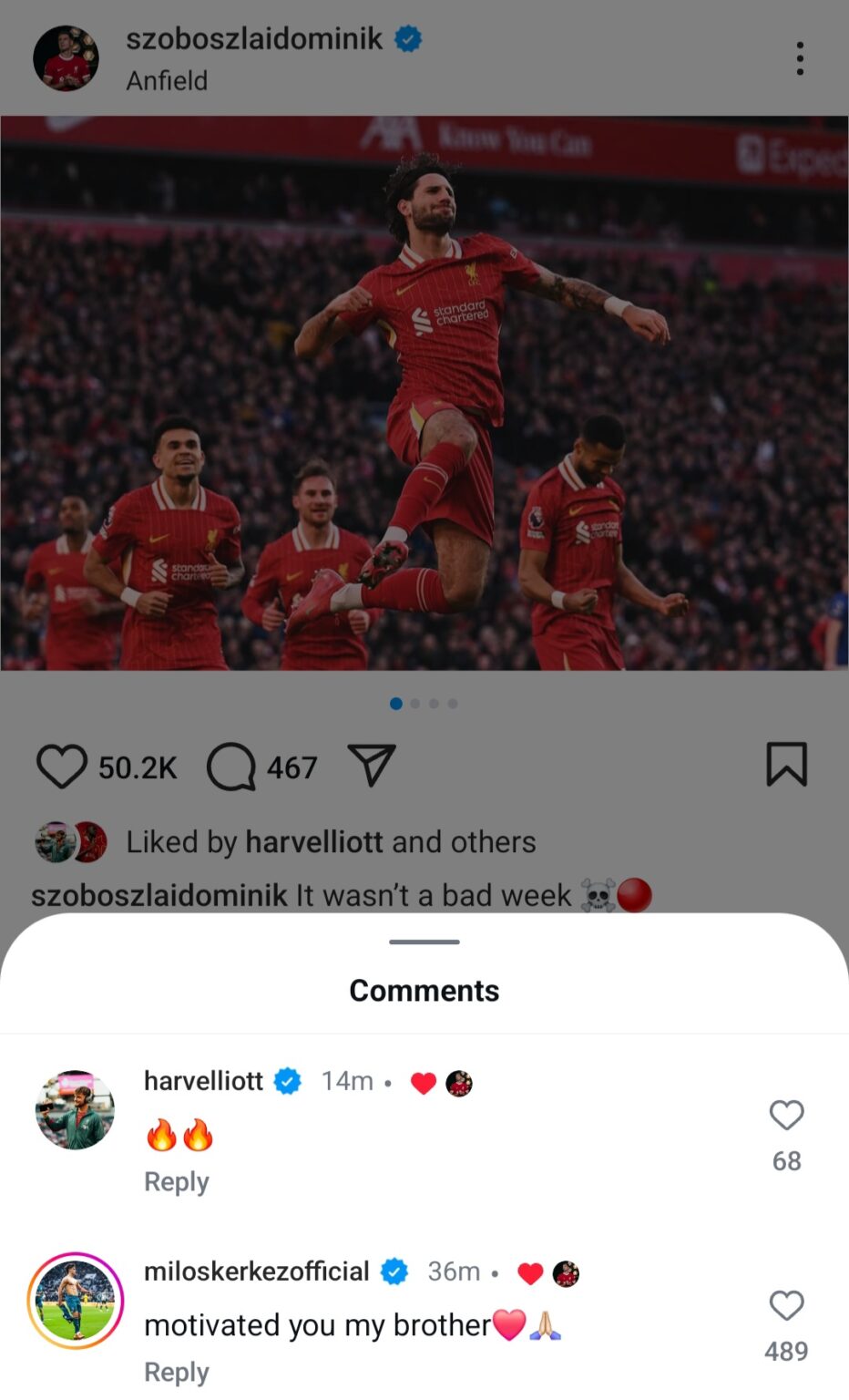 Kerkez Szoboszlai azon posztjára reagált, ahol a magyar válogatott csapatkapitánya elégedetten summázta, hogy a Pool három győzelmet is aratott egy hét alatt, ráadásul ő maga is betalált (nem is akárhogyan) az Ipswich Town elleni, 4-1-re megnyert hétvégi bajnokin: "Nem volt rossz hét" - írta. Kerkez ehhez kommentelte oda viccelődve, hogy biztosan ő motiválta honfitársát és még testvérnek is szólította Szoboszlait.