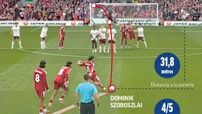 Mint a spanyolok írják, az eredmények igazolják a módszert. A Premier League idei két legtávolabbi szabadrúgásgólja is Szoboszlai nevéhez fűződik: a Manchester City ellen 29,9 méterről, az Arsenal ellen pedig 31,8 méterről talált be.