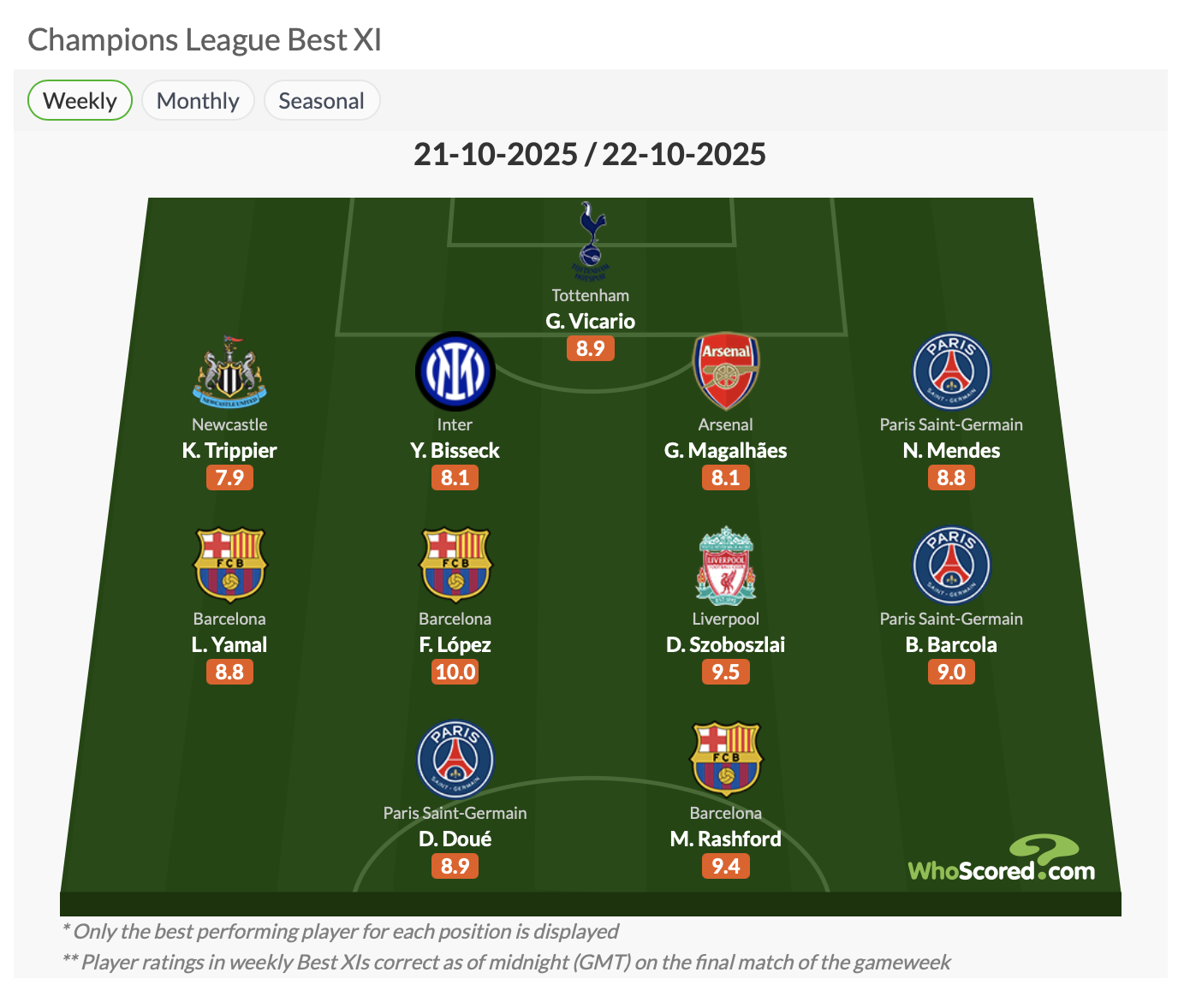 Szoboszlai 9,5-ös értékelésénél csak egyetlen labdarúgó kapott jobbat, a barcelonai Fermín López, akinek tripláznia kellett, hogy megelőzze a magyart.