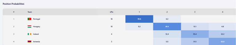 A futballsztatisztikákkal foglalkozó Football Meets Data a szombati játéknap után is elvégezte a selejtezőkre vonatkozó esélylatolgatását, amelyből kiderült, hogy a magyar válogatottnak már 81,9 százalékot adnak arra, hogy a pótselejtezőt jelentő 2. helyen végez a csoportban. Számításaik szerint a négyest Portugália nyeri majd, méghozzá hibátlan teljesítménnyel, Roberto Martinez csapatának - amely nehezen nyert Írország ellen - csoport elsőségére 99,8 százalékot adnak.
