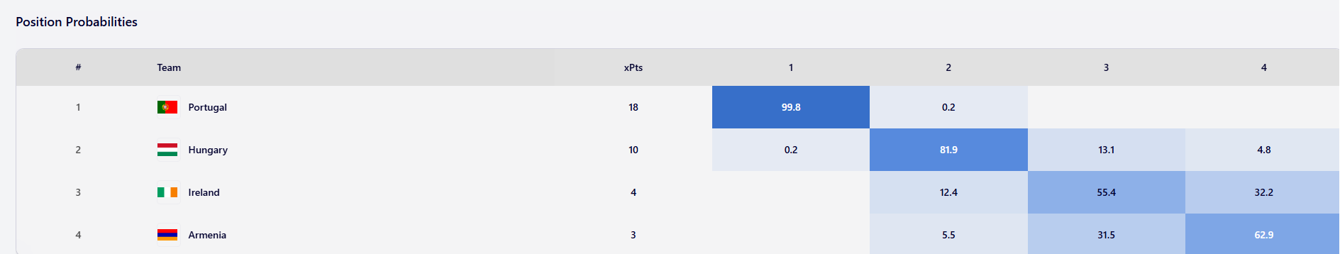 A táblázaton látható, hogy a magyar válogatottnak 10 pontot vetítenek előre, ami azt jelentené, hogy Marco Rossi csapata novemberben az örményeket és az íreket is legyőzné. Noha jelenleg az írek a sereghajtók, az előrejelzés szerint végül megelőzik majd az örményeket és így a csoport 3. helyén zárnak majd.