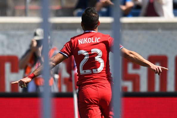 BRIDGEVIEW, IL - APRIL 08: Chicago Fire forward Nemanja Nikolic (23) celebrates his goal during a game between the Columbus Crew FC and the Chicago Fire on April 8, 2017, at Toyota Park in Bridgeview, IL. (Photo by Patrick Gorski/Icon Sportswire via Getty Images)