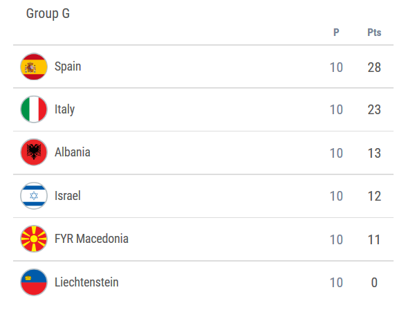 Itt már minden lényeges kérdés eldőlt - a spanyolok az elsők, az olaszok a másodikak. Az utolsó fordulóban a spanyolok és az olaszok szoros meccsen szereztek három pontot. A macedónok a Vasas-játékos Kire Ristevskivel, valamint az ex-újpesti Enis Bardhival a soraikban verték simán Liechtensteint. A Levante támadója gólt is szerzett.