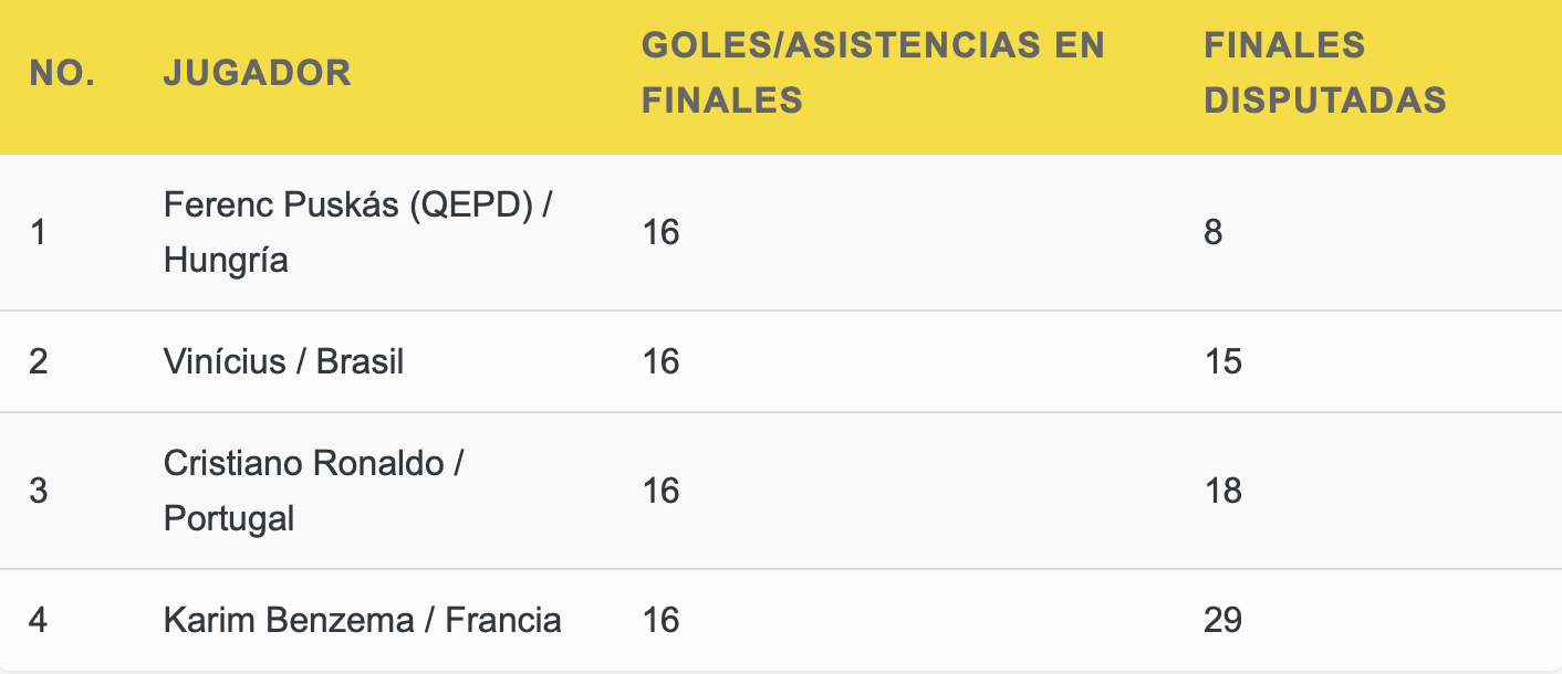 A vonatkozó rekordot eddig Puskás Ferenc, Cristiano Ronaldo és Karim Benzema tartotta, egyaránt 16 góllal, most hozzájuk csatlakozott Vinícius. Puskás azért még kiemelkedik ebből a listából is, ugyanis a magyar legendának ehhez a 16 gólhoz mindössze nyolc döntőre volt szüksége, míg Viníciusnak 15-re, Ronaldónak 18-ra, Benzemának pedig 29-re.