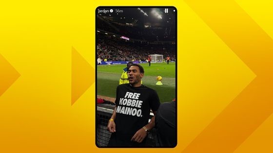 Kobbie Mainoo testvére „Free Kobbie Mainoo” feliratú pólóban jelent meg a hétfői, Bournemouth elleni mérkőzésen az Old Traffordon. A középpályás féltestvére, Jordan Mainoo-Hames az Instagram-sztorijában osztott meg egy fotót, amelyen a pálya mellett látható. (Sky Sports)