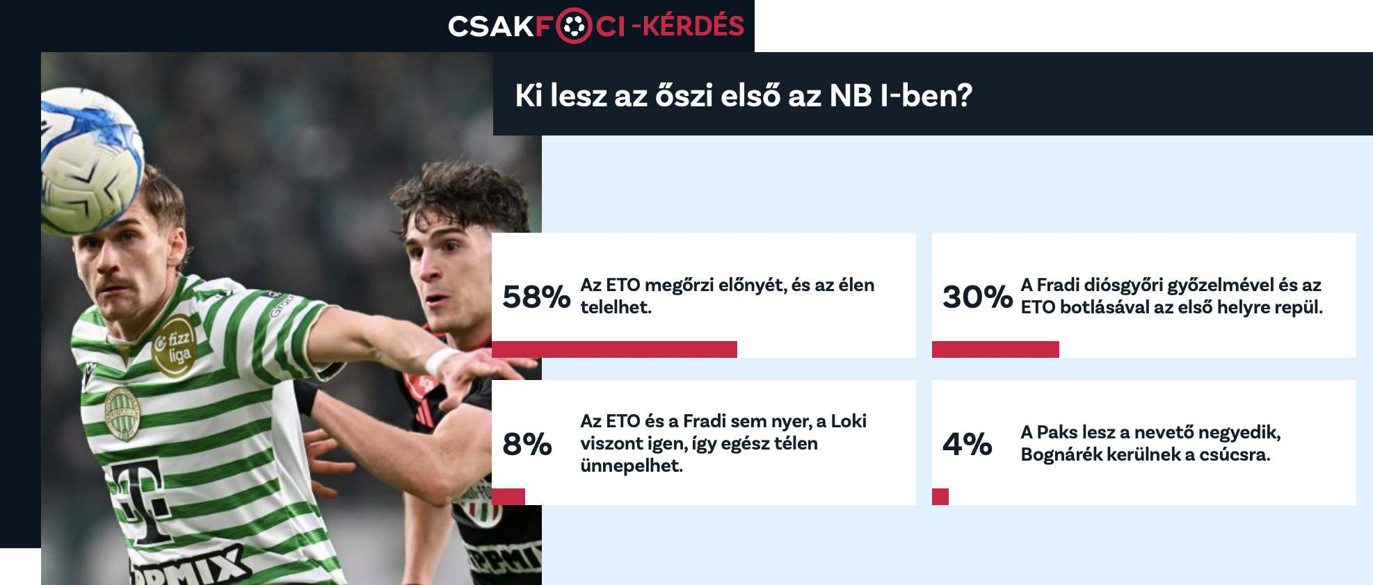 A legtöbben (58%) úgy gondolják, hogy a jelenleg is éllovas ETO marad az első helyen, ez abban az esetben biztosan sikerül, ha a győriek legyőzik hazai pályán az ötödik helyezett Puskás Akadémiát. Számottevő szavazatot még az a válaszlehetőség kapott, hogy a Fradinak sikerül előznie az utolsó őszi fordulóban (30%): ehhez arra van szükség, hogy az FTC több pontot szerezzen, mint az ETO (illetve ha ez úgy sikerül, hogy a Fradi ikszel, a Győr pedig kikap, akkor a gólkülönbségre is figyelni kell még, jelenleg eggyel jobb a Rába-parti együttes).