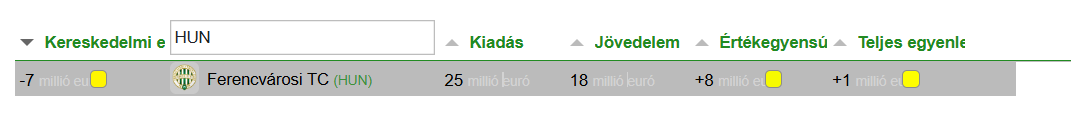 - Kereskedelmi (trading) mérleg: Az adott időszakban megvásárolt és már továbbértékesített játékosoknál a bevétel és a kiadás különbsége. A bevételeknél az esetleges bónuszokat és továbbértékesítési díjakat is figyelembe vették, függetlenül attól, hogy azokat ténylegesen kifizették-e vagy sem.