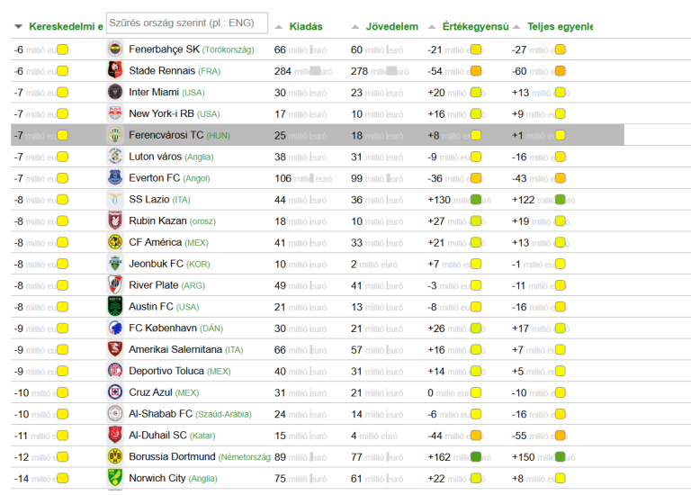 A rangsorban szerepel a Ferencvárosi TC is, amely a magyar klubfutballban egyedüliként került be az elemzésbe. A Fradi 2021 óta 25 millió eurót költött és 18 milliót keresett játékoseladásokból, így a klub kereskedelmi mérlege mínusz 7 millió euró volt. Ugyanakkor a klubnál maradó labdarúgók piaci értékének emelkedése plusz 8 millió eurót jelent, ami ellensúlyozza a negatív egyenleget, így a Ferencváros összességében +1 millió eurós teljes mérleget ért el. Ez arra utal, hogy a klub a játékosfejlesztésben és a keret értéknövelésében pozitívan működik, még akkor is, ha az eladások és vásárlások közvetlen mérlege valamelyest negatív.