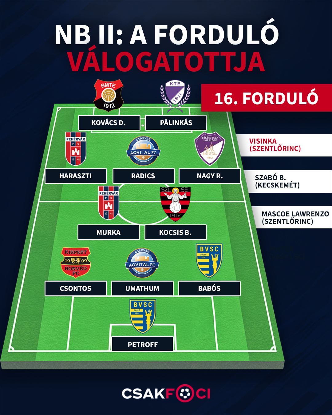 Radics Márton (Csákvár): Hatalmas mezőnymunka, minőségi megoldások, és remek, gólpassz érő labda, ami végül pár centi híján nem lett az, mivel a játékvezető les miatt érvénytelenítette a találatot.