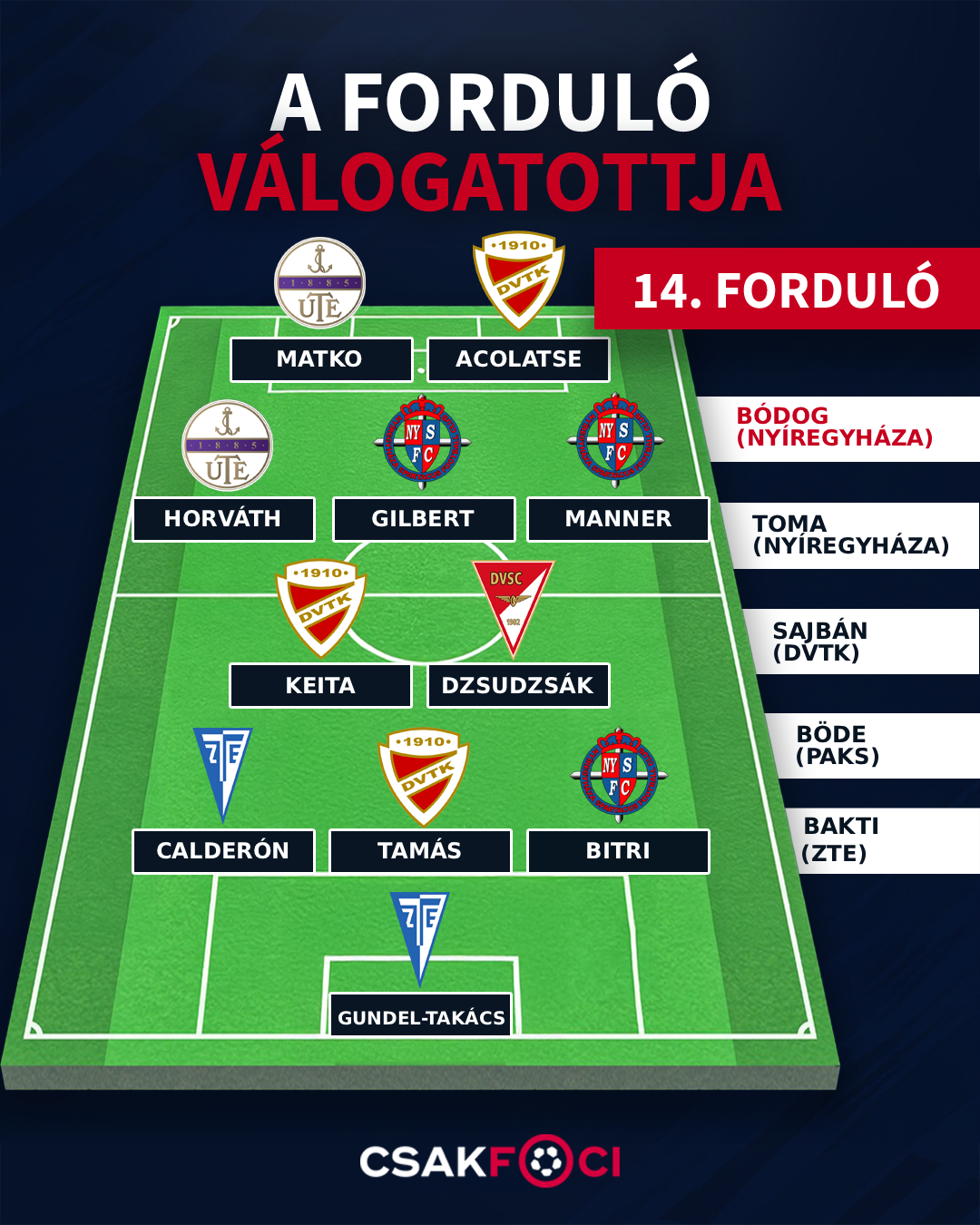 Elton Acolatse (DVTK): Csak a szokásos, ezúttal is csapata legjobbja volt. Szinte minden akcióban benne volt, rengeteget gondot okozott a védőknek. A DVTK minden góljában szerepet vállalt: betalált tizenegyesből, gólpasszt adott Tamásnak és Keitának, illetve a lövése utáni kipattanót passzolta be közelről Babos.
