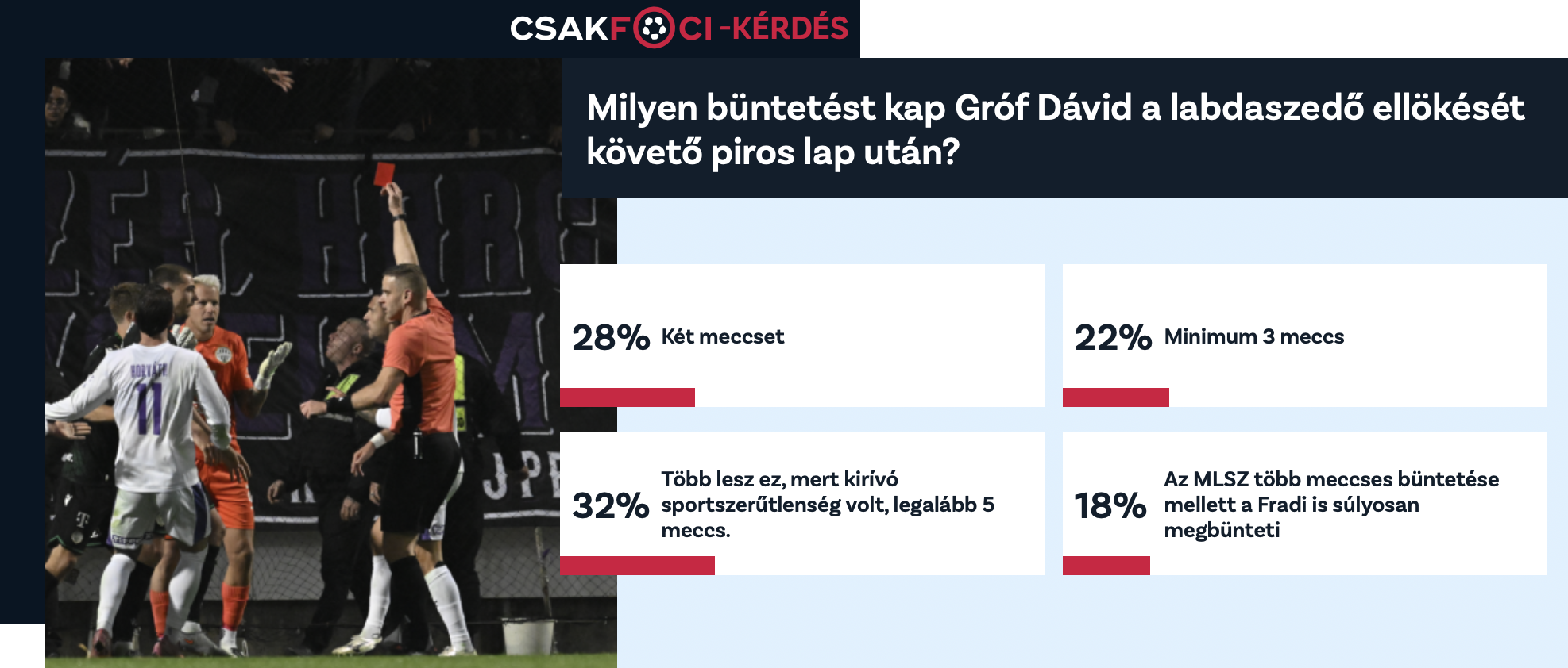 A legtöbben úgy gondolják, nem ússza meg enyhe eltiltással Gróf: 32 százaléknyian voksoltak arra, hogy a kirívó sportszerűtlenség miatt minimum öt meccset kap a kapus. Ennél kicsit kevesebben, 28 százaléknyian vélekednek úgy, hogy a minimum büntetéssel, azaz két meccsel számolhat majd a rutinos labdarúgó.
