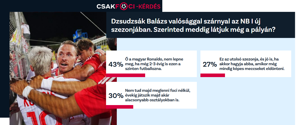 Ezért feltettük a kérdést: meddig látjuk még a pályán Dzsudzsákot? A kérdésre ezúttal is olvasóink válaszoltak, és az eredmények egyértelműen mutatják, hogy a közönség még korántsem kész búcsút venni a korábbi válogatott klasszistól.