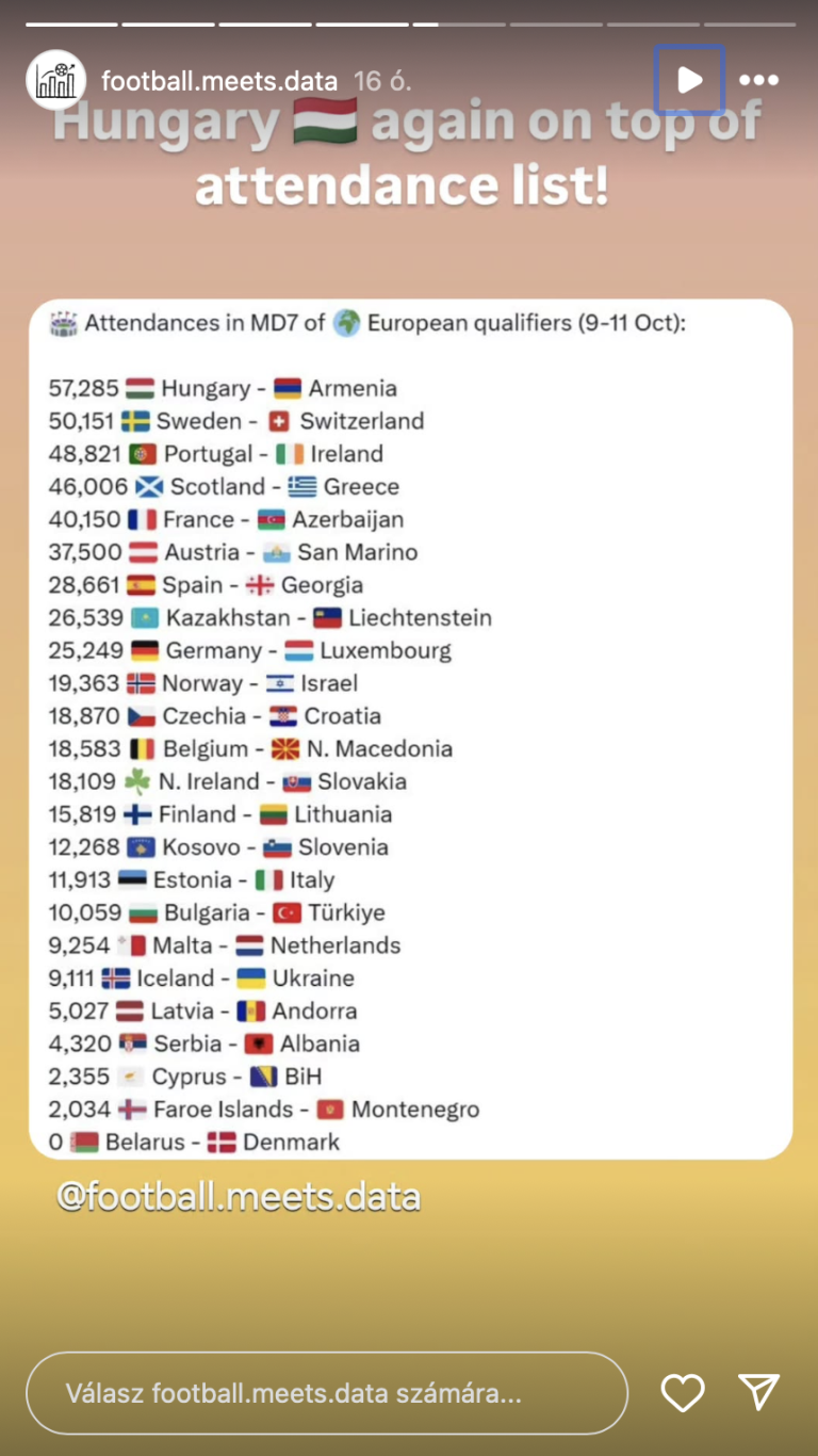 A Football Meets Data az újabb játéknap után ismét közzétette a nézőszámos rangsort, ezek alapján pedig ismét Marco Rossi együttese csábította ki a legtöbb embert a stadionba. Ezúttal több mint 57 ezres adatról számolnak be, ezzel a svéd-svájci és a portugál-ír összecsapást (valamint az összes többit) megelőzve zártunk az élen.