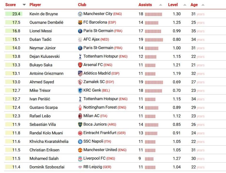 A svájci székhelyű Sporttudományok Nemzetközi Központjának (CIES) legfrissebb tanulmánya az elmúlt 365 napot figyelembe véve összeállította nagy gólpasszkirály-listáját, amelyben a világ 75 különböző bajnokságának legjobb kiszolgálói kaptak helyet. A rangsor összeállításánál súlyozták az egyes bajnoki meccseket a nehézségük alapján, így nem pusztán a gólpasszok száma, hanem az adott mérkőzések nehézsége alapján kaptak pontszámot (score) a játékosok.