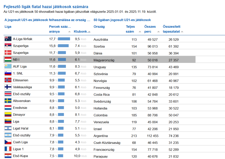 A svájci székhelyű Sporttudományok Nemzetközi Központjának (CIES) legfrissebb kutatásában bemutatták, hogy a világ élvonalbeli bajnokságai milyen arányban szerepeltetik idén az U21-es, hazai kötődésű játékosokat. A rangsorban az NB I az élmezőnyben végzett: a magyar élvonal a negyedik helyet szerezte meg, miután a fiatal magyar futballisták a 2025-ös naptári évben a játékidő 11,6%-át kapták.