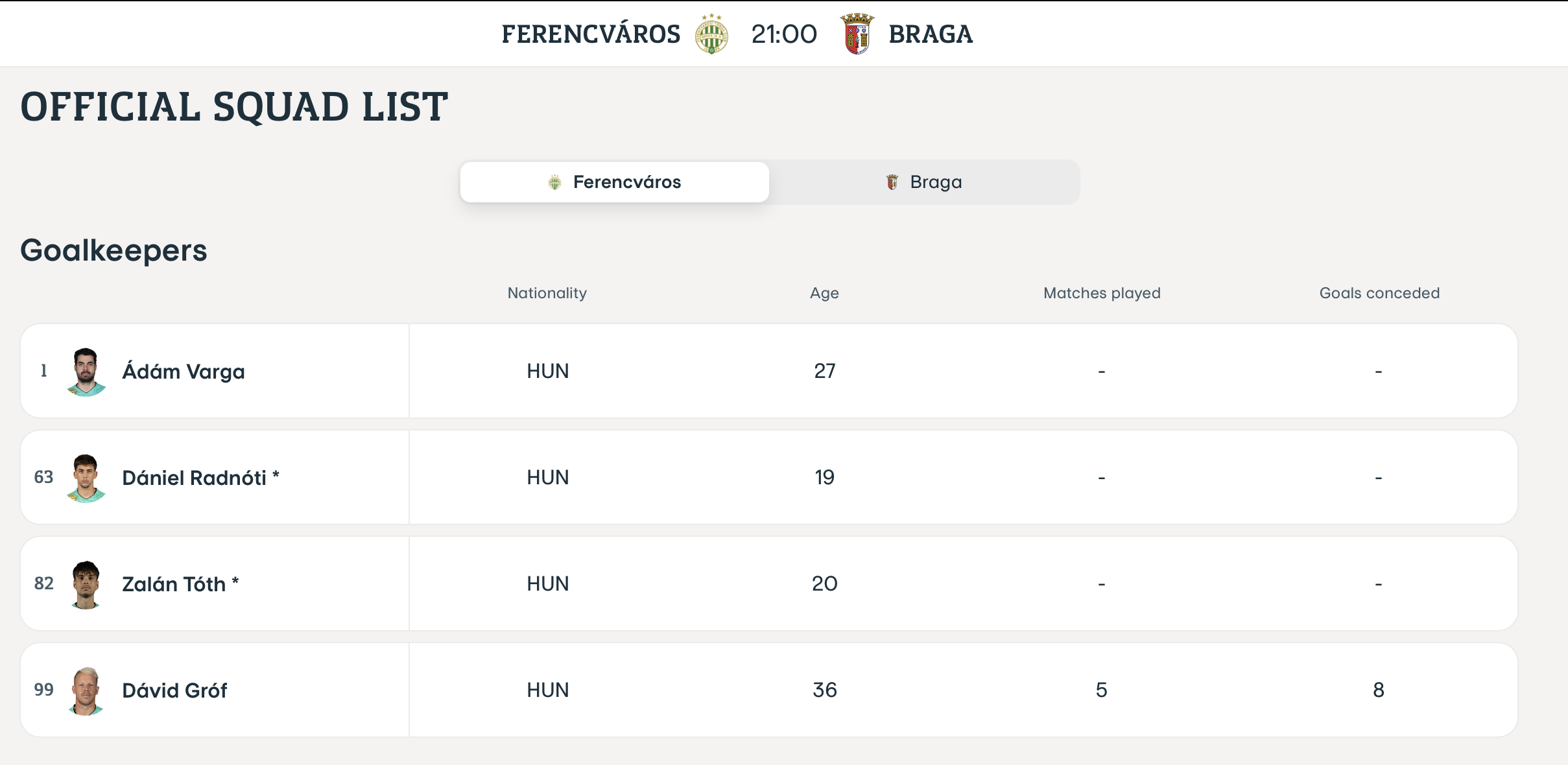 Bár Dibusz Dénes a hétvégén a Nyíregyháza elleni NB I-es bajnokin ott volt az FTC kezdőcsapatában, és végigvédte az összecsapást, ugyanez nem történik majd meg ma (csütörtök) este a Braga elleni Európa Liga-nyolcaddöntős mérkőzésen. A magyar válogatott kapust ugyanis az FTC nem cserélte vissza a csapat UEFA-keretébe - látható a szövetség oldalán, amit az M4 Sport szúrt ki.