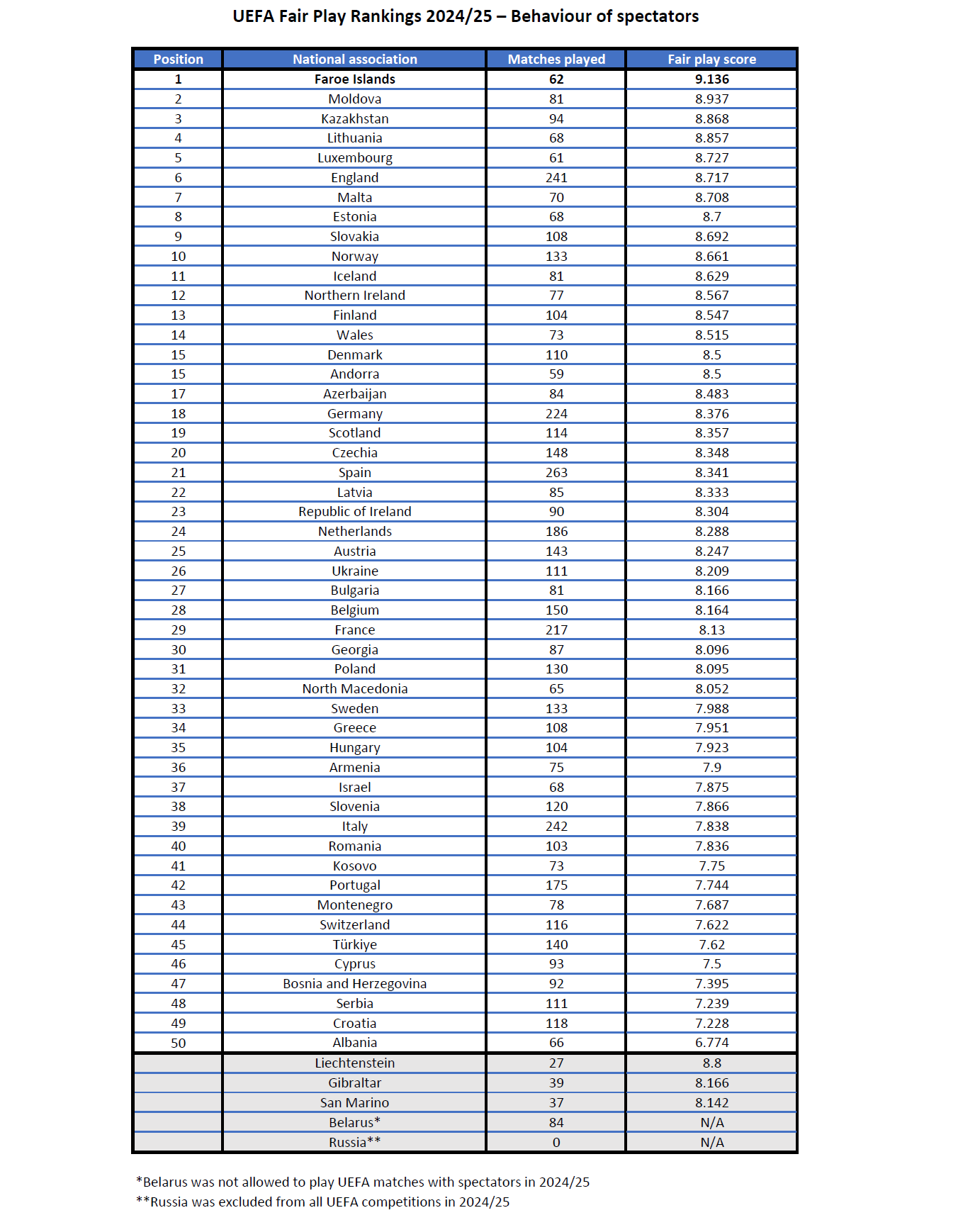 Az UEFA nyilvánosságra hozta a 2024/25-ös szezon Fair Play-rangsorát, amelyet ezúttal a nézők viselkedése alapján is összeállították, azaz a listán az európai klub- és válogatott mérkőzések szurkolói magatartását értékelték.