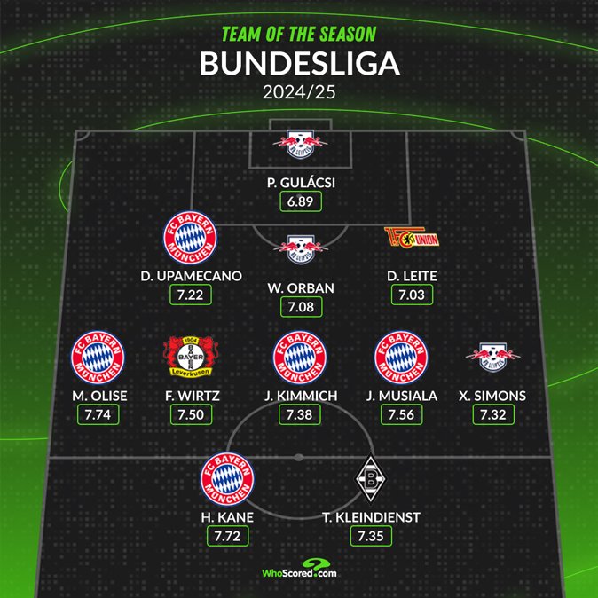 A bajnok FC Bayern München négy, a második Bayer Leverkusen két játékost is delegált a német Bundesliga 2024/2025-ös idényének álomcsapatába, amelyet a ComunioMagazin állított össze.