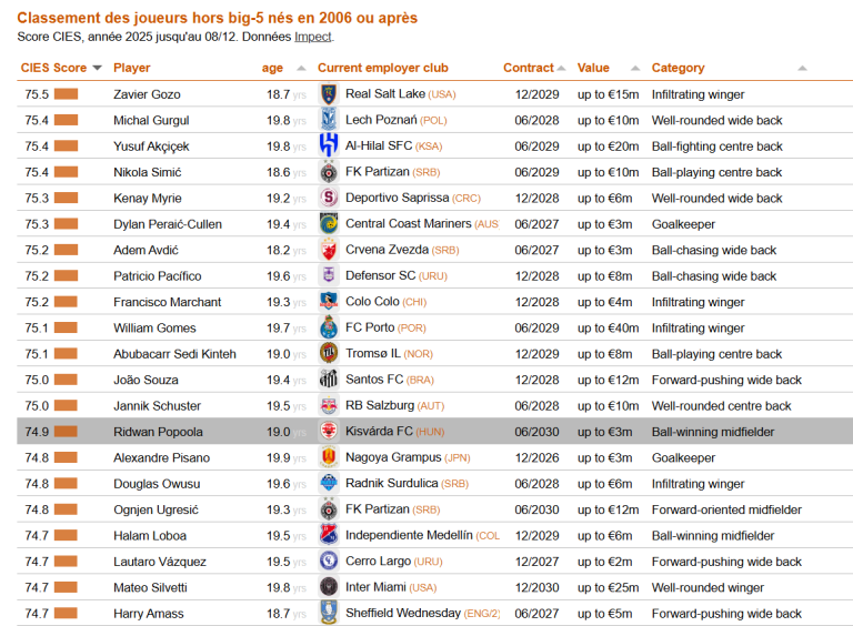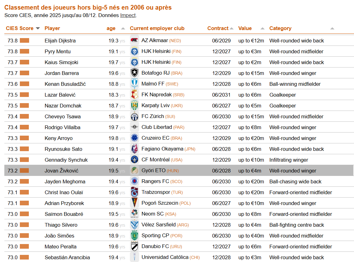 A svájci székhelyű Sporttudományok Nemzetközi Központjának (CIES) legfrissebb kutatásában a 2006-ban vagy később született, a top öt európai bajnokságon (angol, spanyol, német, olasz, francia) kívül futballozó játékosok teljesítményét vizsgálták. A rangsor a világ 100 legjobban teljesítő fiatalját mutatta be ebben a korosztályban, egy, a CIES által kifejlesztett speciális módszertan alapján. Az elemzés nemcsak összesített rangsort, hanem 15 külön kategóriában - többek között párharcok, labdaszerzés, passzjáték, cselezés, helyzetkialakítás és befejezés - is rangsorolta az U20-as korosztály legjobbjait, figyelembe véve a játékosok aktivitását és elsődleges posztját.
