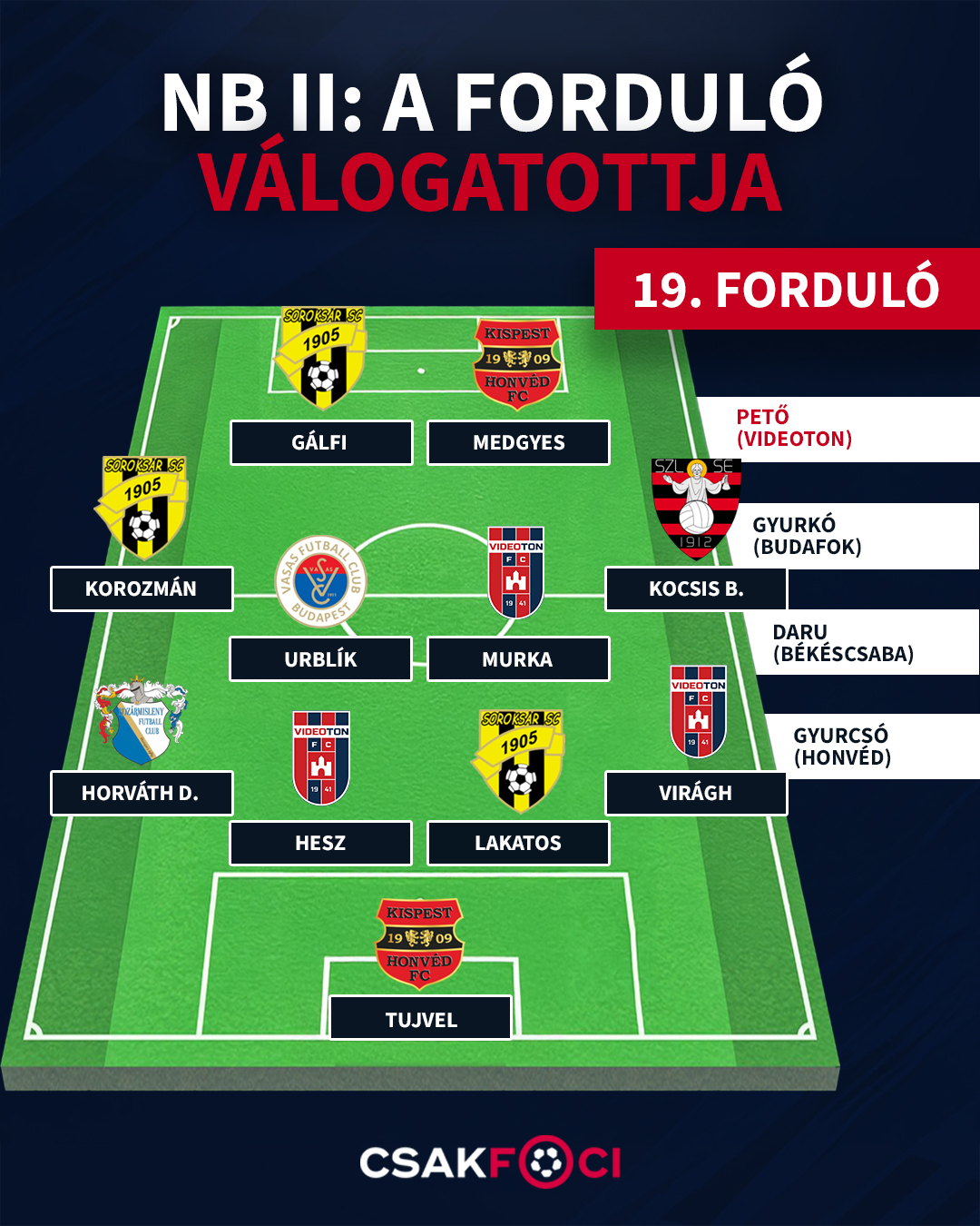 Lakatos Csongor (Soroksár): Saját kapuja előtt biztos pont volt, egyszer a gólba tartó labdánál mentett önfeláldozóan, a másik kapu előtt pedig bombagólt fejelt.