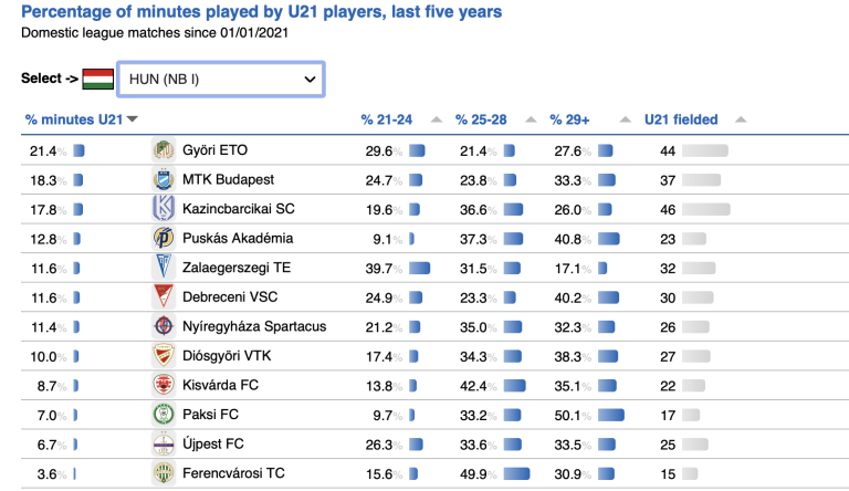 az ETO a 19., az MTK a 32., a KBSC pedig a 39. a világ 55 ligájában játszó együtteseket összesítő táblázaton. A győrieknél a játékpercek több mint 21 százalékát töltötték U21-es labdarúgók a pályán az elmúlt öt évben (2021. január 1-től), az MTK-nál 18,3 %, a Barcikánál 17,8 százalék ez a szám.