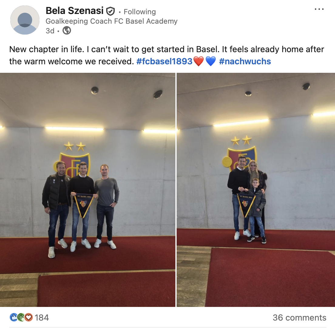Szénási most Svájcba, a rekordbajnok FC Basel akadémiájára igazolt, ahol ugyancsak a kapusokkal foglalkozik majd - derült ki az edző LinkedIn-bejegyzéséből.