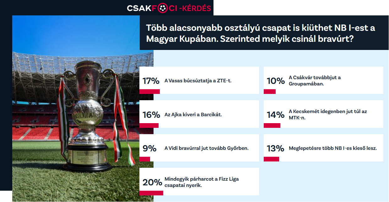 Azok, akik szerint több NB I-es kieső lesz a következő körben, a szavazók 13 százalékát tették ki. A legalacsonyabb támogatottságot két lehetőség kapta: a Csákvár továbbjutását a Groupamában 10%, a Vidi bravúrját Győrben 9% szavazta meg.