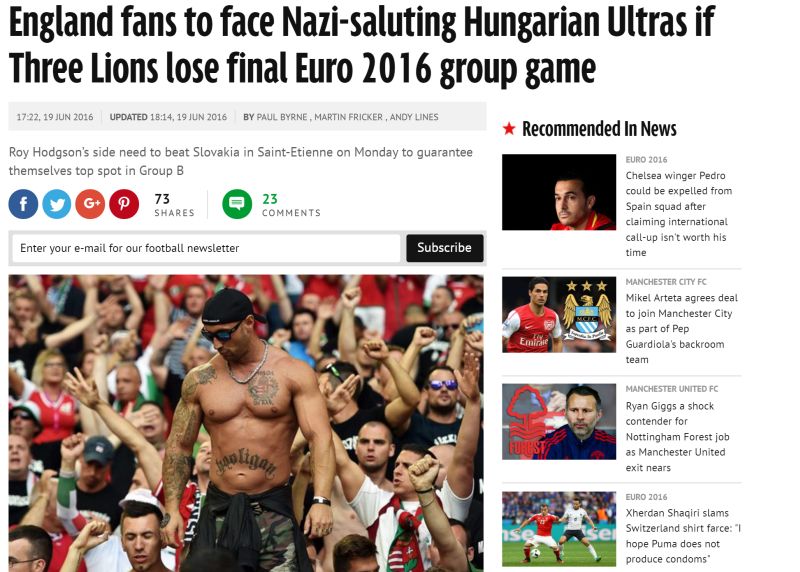 "Az angol szurkolók a náci karlendítésekkel köszönő magyar ultrákkal találkozhatnak, ha kikap az angol válogatott az utolsó csoportmeccsén” – figyelmeztet a Mirror című lap az esti, Szlovákia elleni találkozót felvezetve, és a magyar válogatottat, mint lehetséges ellenfelet kiemelve.