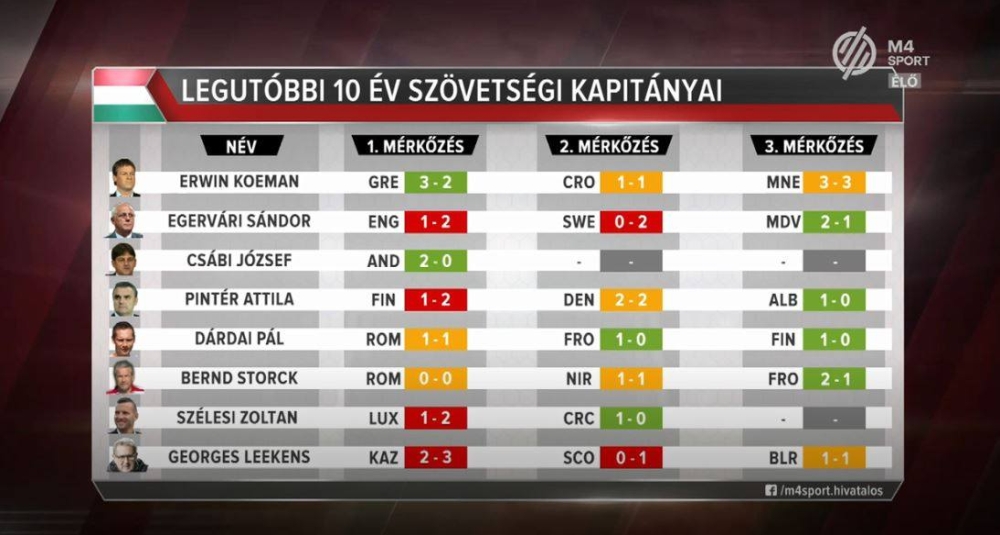 Az M4 Sport mutatott rá arra, hogy ezzel a belga kapitány különös és nem túl pozitív rekordot tudhat magáénak az elmúlt egy évtizedet tekintve. Leekens előtt hét szövetségi kapitány sem kezdett olyan rosszul a válogatott kispadján, mint ő (a hétből két trénernek, Csábi Józsefnek, illetve a belga stábjában is helyet kapott Szélesi Zoltánnak egy, valamint két meccs jutott, de mindketten tudtak így is győzni).