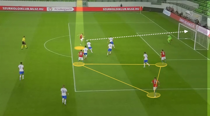 A platformon megvizsgálták, hogyan mozogtak a magyar játékosok - Sallai Roland, valamint a találatot megelőzően háromszor is fejjel passzoló Varga Roland, Szalai Ádám és Bese Barnabás - a vezető találatot megelőzően, hogyan alkottak olyan háromszöget, amellyel nem csak a védőket zárták ki a labda útjából, de elő is készítettek a "terepet" Sallainak, aki aztán kapásból, szemet gyönyörködtetően a léc alá bombázott.