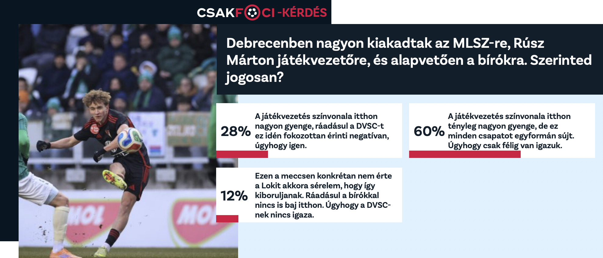 A legtöbbek szerint (60%) abban igaza van a Lokinak, hogy a hazai játékvezetés színvonala nagyon gyenge, abban azonban nem, hogy ez őket jobban érintené, mint másokat. Nagyjából minden negyedik ember (28%) úgy látja, hogy a DVSC-t idén tényleg fokozottan érinti a rossz bíráskodás, ezért joggal emelték fel a hangjukat ez ellen.