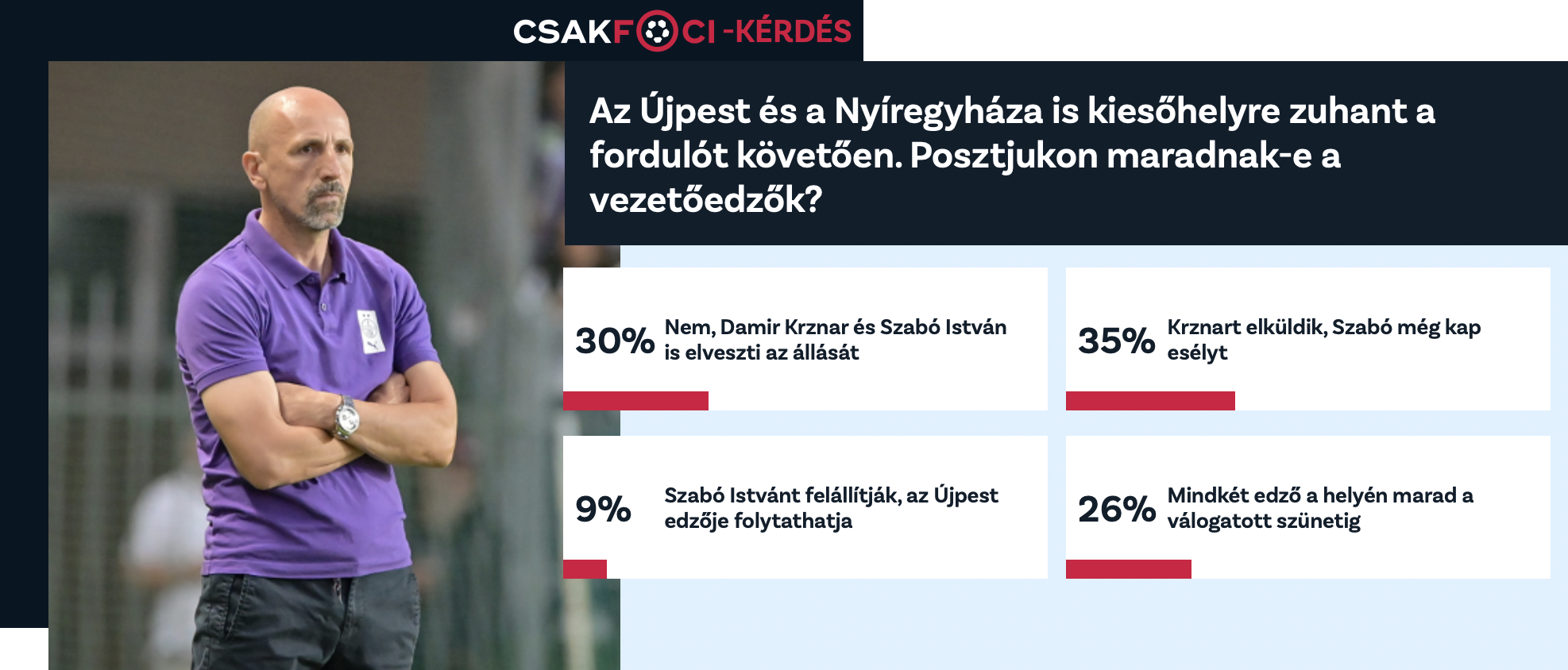 Arra körülbelül minden negyedik ember számít (26%), hogy mindkét edző a helyén marad a válogatott szünetig, míg 30 százalék szavazott arra, hogy Krznarnak és Szabónak is mennie kell.