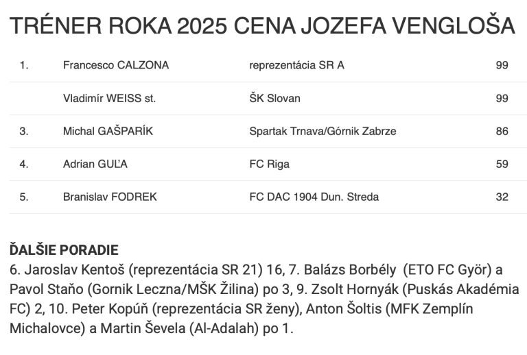 A Szlovák Labdarúgó-szövetség (SFZ) hagyományos ankétján ismét megválasztották az év legjobbjait különböző kategóriákban. Az év edzője díjat megosztva kapta Francesco Calzona szövetségi kapitány és Vladimír Weiss, a Slovan Bratislava vezetőedzője. Calzona először részesült az elismerésben, és hangsúlyozta: célja, hogy a válogatott 16 év után ismét kijusson a világbajnokságra (ehhez Koszovót és a török-román meccs győztesét kell megverniük a playoffban). Weiss a mostani elismeréssel már nyolcadik alkalommal nyerte el a díjat - számol be róla a Paraméter.