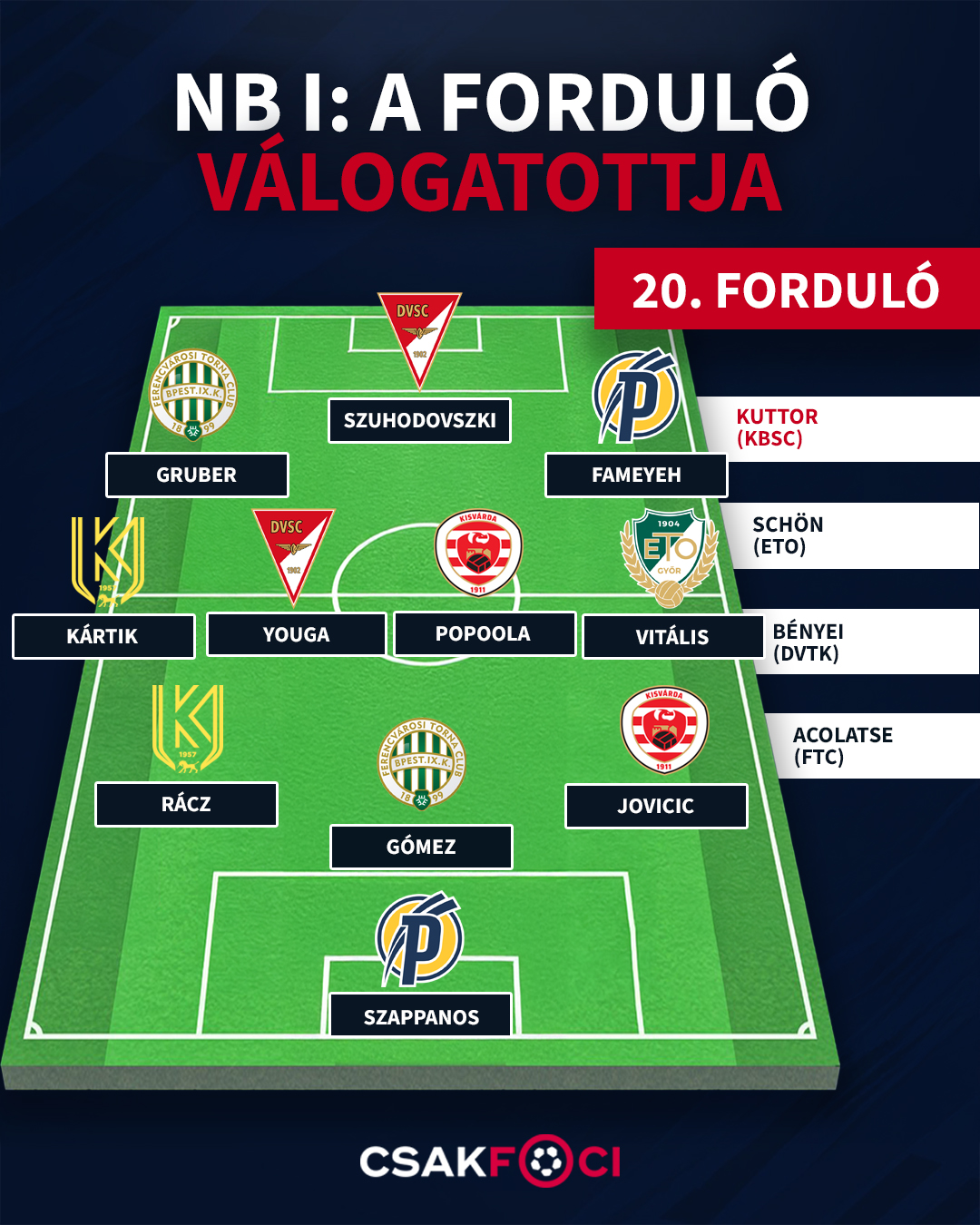 Szappanos (Puskás) - Jovicic (Kisvárda), Gómez (FTC), Rácz (KBSC) - Vitális (ETO), Popoola (Kisvárda), Youga (DVSC), Kártik (KBSC) - Fameyeh (Puskás), Szuhodovszki (DVSC), Gruber (FTC)