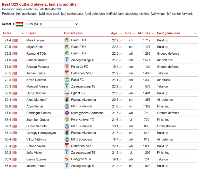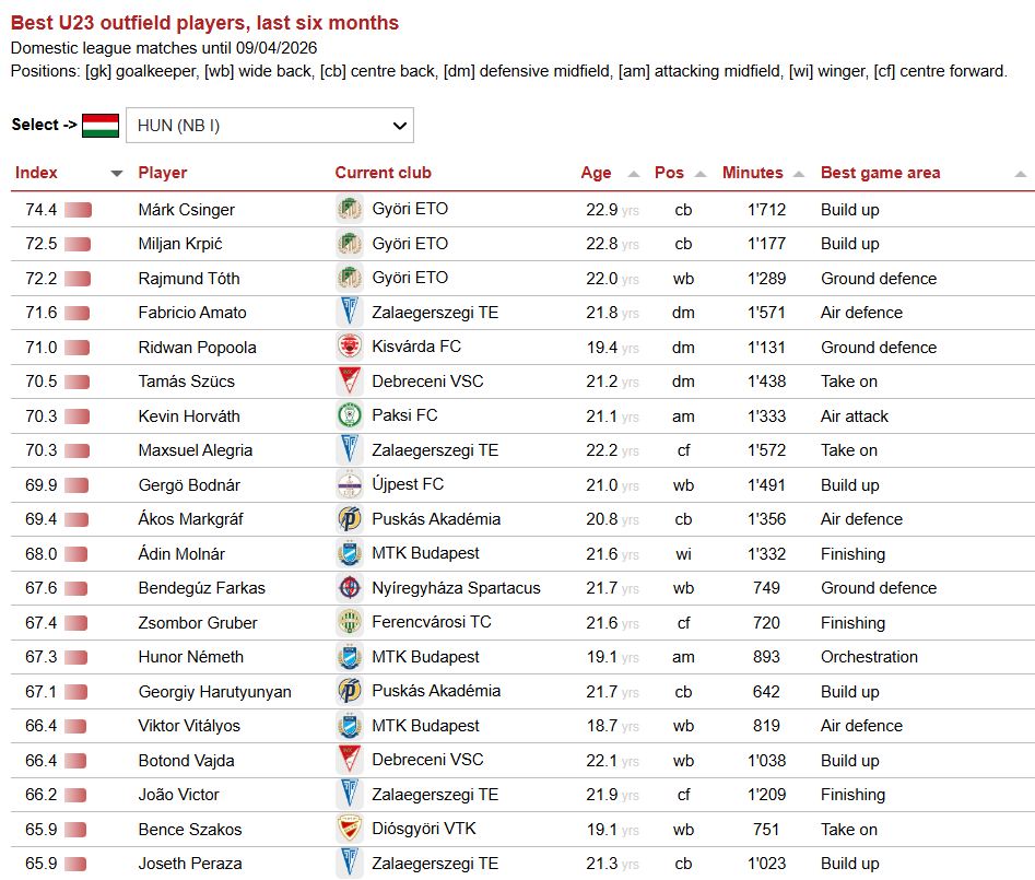 Az összevetés a magyar bajnokságot külön is elemezte, a dobogót egészében az ETO FC uralta: Csinger Márk (74,4-es index), Miljan Krpic (72,5-ös index) és Tóth Rajmund (72,2-es index) ért oda az első háromba. Csingernél és Krpicnél a támadásépítést emelték ki, mint legerősebb játékterület, míg Tóth esetében a földi párharcokban való védekezés a legerősebb.