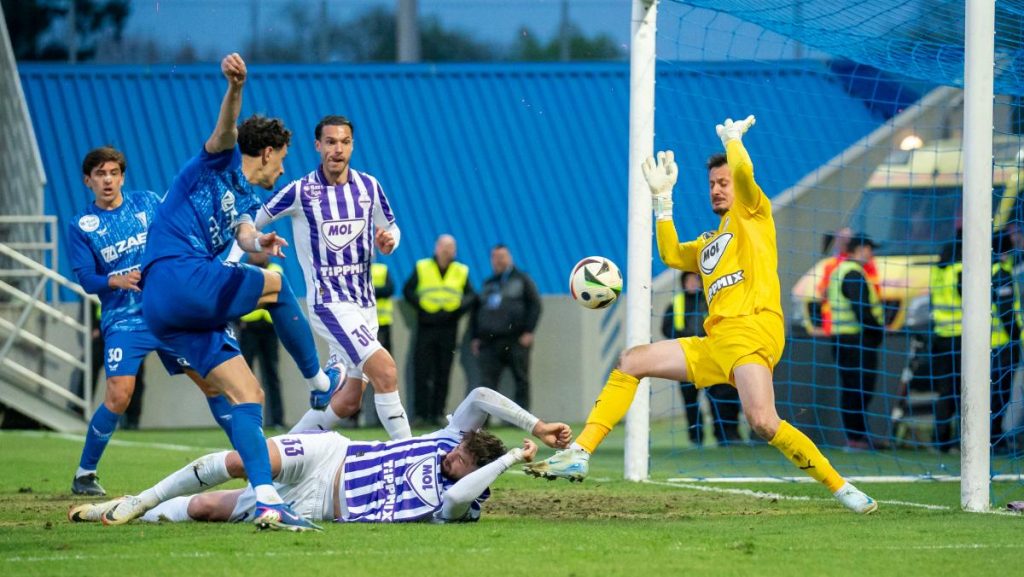 A félidő derekán Kiss egy lassú labdára csapott le, majd Stronati szorításában a földre került, de a játékvezető, Derdák Marcell továbbot intett. Kicsivel később felpörgött a mérkőzés: Szendrei indította Csonkát, aki egy csellel faképnél hagyta Gergényit, majd visszatette a labdát Kissnek - lövése Stronatiban akadt el. A kipattanót Joao Victor tűzte kapura, de próbálkozása szögletre vágódott, amely végül veszélytelen volt.