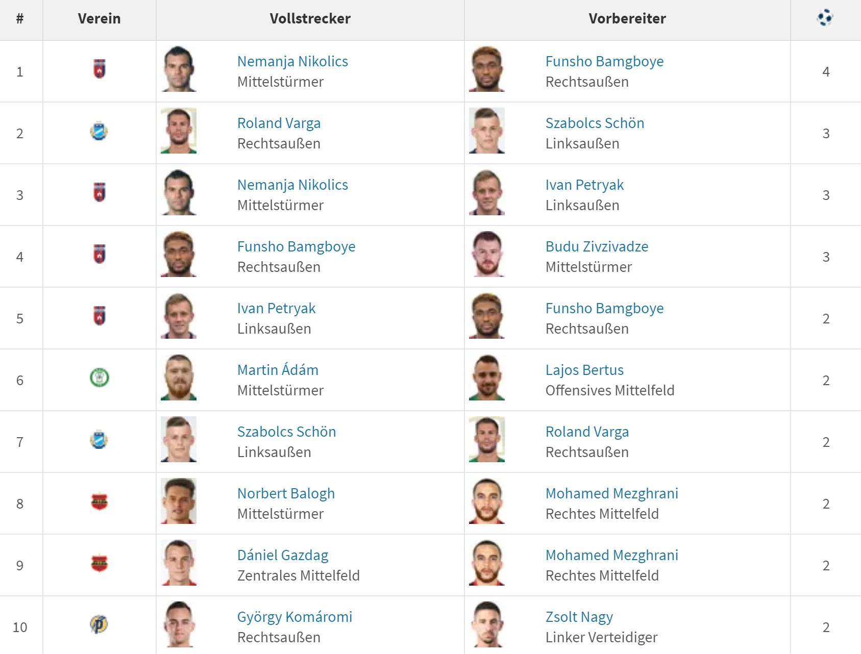 A közvetlen élmezőny tagja viszont már most az a páros, amely csak a télen állt össze. Varga Roland alig néhány hete igazolt az MTK Budapesthez a Ferencvárostól, de máris húzóember a kék-fehéreknek, 9 meccsen 6 gólt és 4 asszisztot jegyzett már. És remekül megérti magát máris az MTK másik szélső támadójával, Schön Szabolccsal, hiszen közös munkával már 5 gólt hoztak össze. Varga 3-szor, Schön pedig 2-szer volt már eredményes viszonylag rövid idő alatt, azaz villámgyorsan összeállt az a párossal, amit alighanem Michael Boris is szeretett volna.