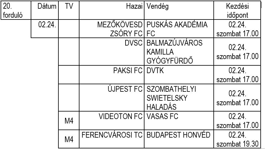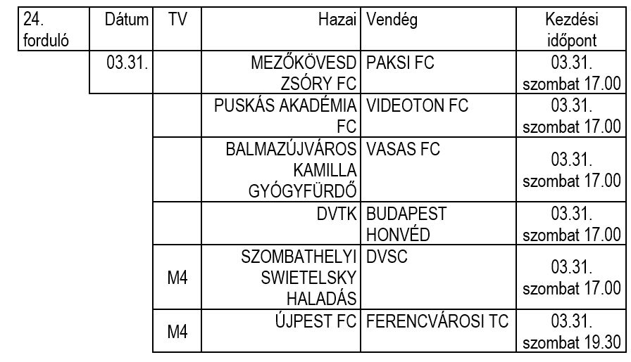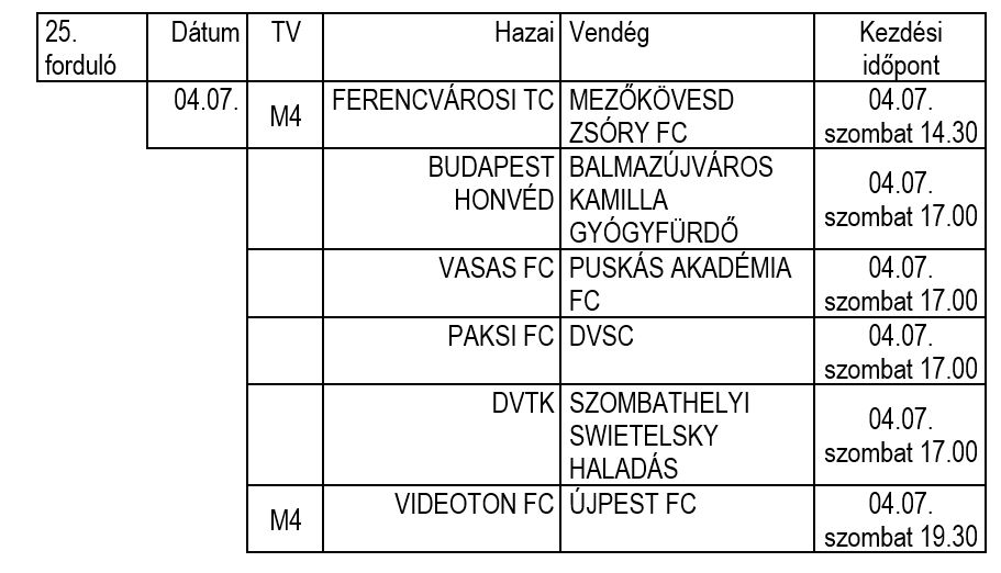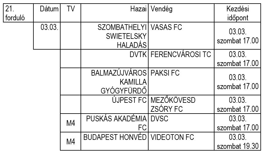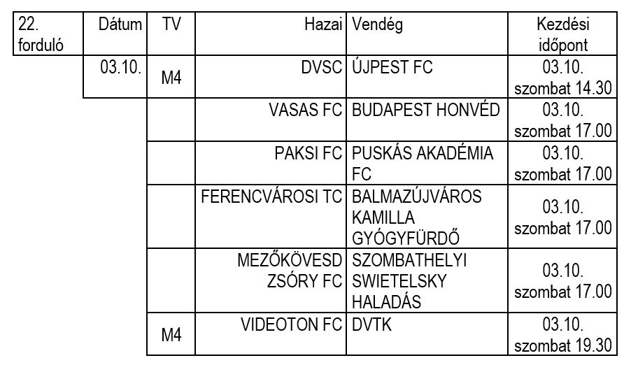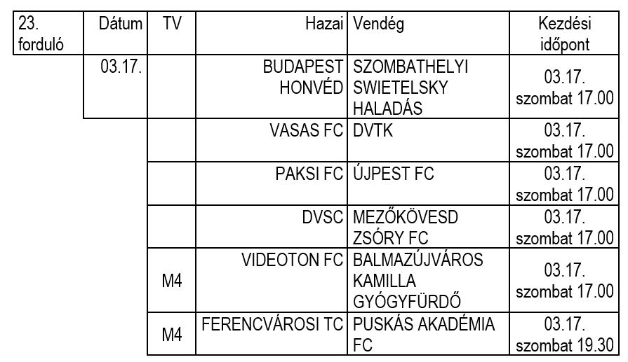 Az M4 vezetésének kezdeményezését követően alakult ki az a hosszú távú közvetítési gyakorlat, amely 2018 tavaszától jelent tervezhetőséget a szurkolók számára az NB I-es mérkőzések kapcsán - írja az mlsz.hu. Nincs jelentős eltérés a korábbi időszakhoz képest: a mérkőzések általános kezdési időpontja szombat 17 óra, illetve 19.30 óra lesz. Esetenként, és különösen indokolt esetben, amikor a program kiemelt nemzetközi sporteseménnyel ütközik, kerül egy-egy mérkőzés ettől eltérő időpontra, mely jellemzően a 14.30-as idősáv lehet. A jelenlegi ütemezés minden érintett: a szurkolók, a tévénézők, a klubok, illetve az MTVA és az MLSZ számára is a korábbinál nagyobb kiszámíthatóságot jelent.