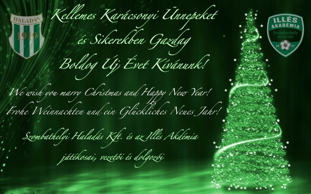 "Valamennyi Haladás-szurkoló számára békés, boldog, meghitt ünnepeket kívánunk az Illés Akadémia és a Szombathelyi Swietelsky-Haladás játékosai, edzői, vezetői, dolgozói nevében" - a szombathelyi üzenet magyar, angol és német nyelven.
