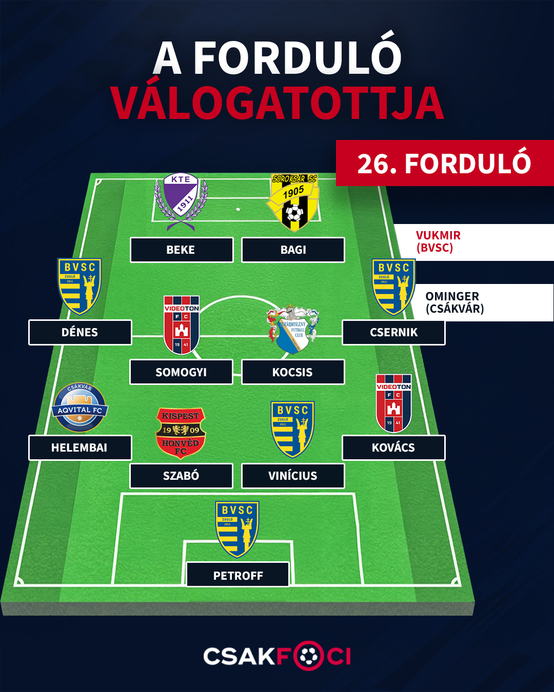 Csernik Kornél (BVSC): Nemcsak a mezőny, de a forduló legjobb játékosa volt ezúttal. Rúgott egy parádés gólt, de végig tarthatatlan volt, szinte nem volt rossz megoldása.