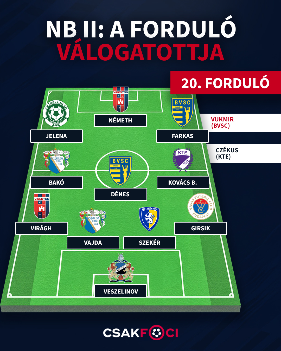 Dénes Adrián (BVSC): Remek gólpasszt adott a nagyon fontos első gól előtt, és végig jó mentalitással, aktívan játszott.