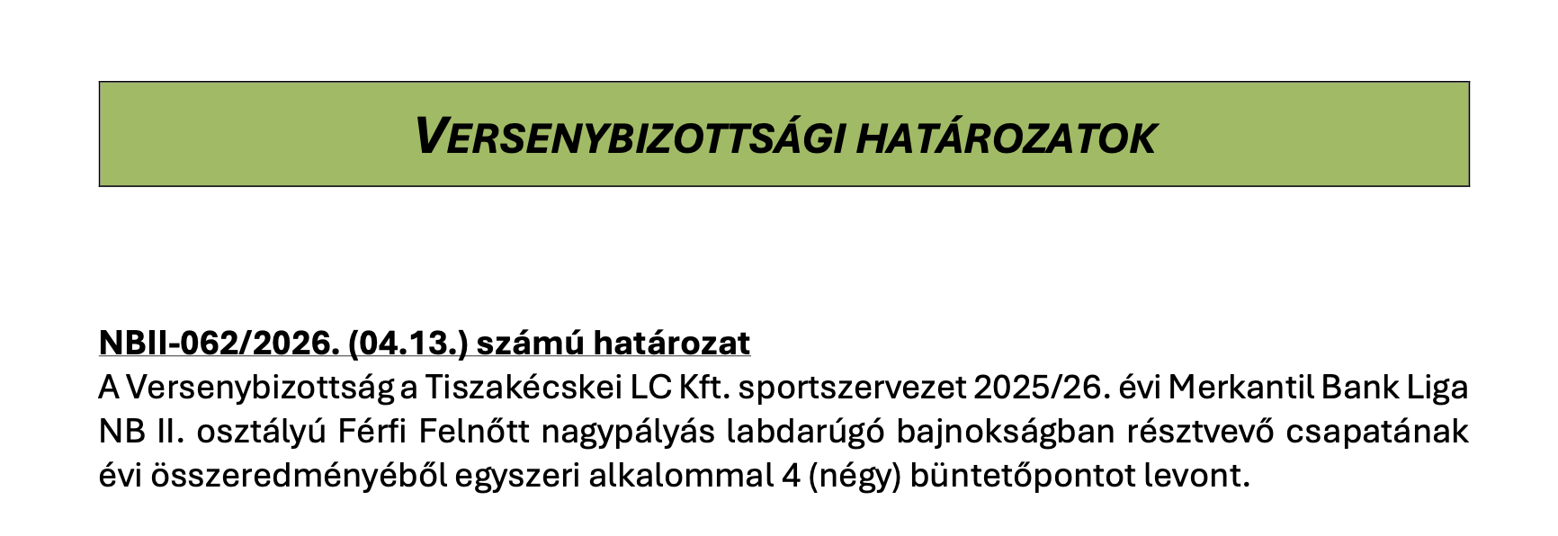 Ez be is igazolódott, az MLSZ legutóbbi hivatalos értesítője (04.24.) szerint "a Versenybizottság a Tiszakécskei LC Kft. sportszervezet 2025/26. évi Merkantil Bank Liga NB II. osztályú Férfi Felnőtt nagypályás labdarúgó bajnokságban résztvevő csapatának évi összeredményéből egyszeri alkalommal 4 (négy) büntetőpontot levont."
