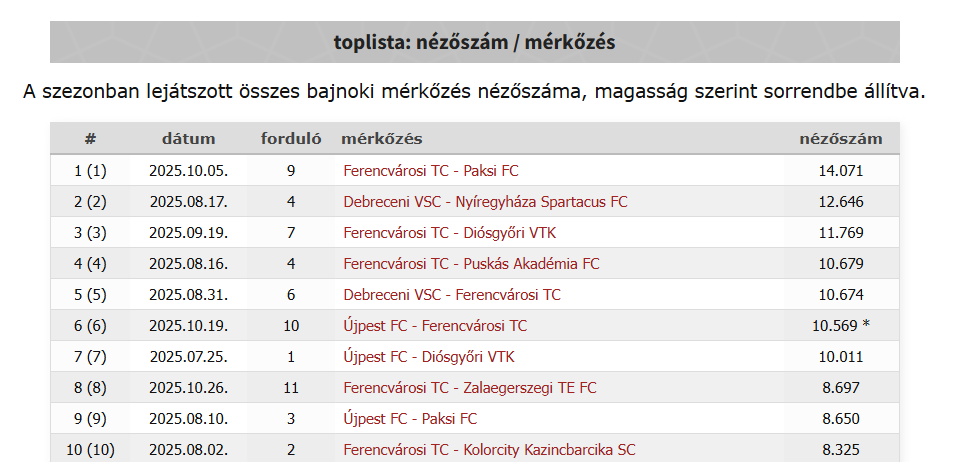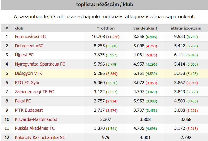 A Ferencváros otthoni átlagnézőszáma 10708 fő, ami ugyan a legmagasabb a ligában, de elmarad a tavalyi 11236 fős átlagtól, ezzel szemben a - hazai meccseket tekintve második helyen álló - Debreceni VSC hatalmas előrelépést mutat: az idei 8255 fős átlag jóval magasabb a tavalyi 5680-hoz képest. A harmadik helyen található Újpest FC otthoni átlaga 7875 fő, szintén jelentős emelkedés a tavalyi 5957-hez képest.