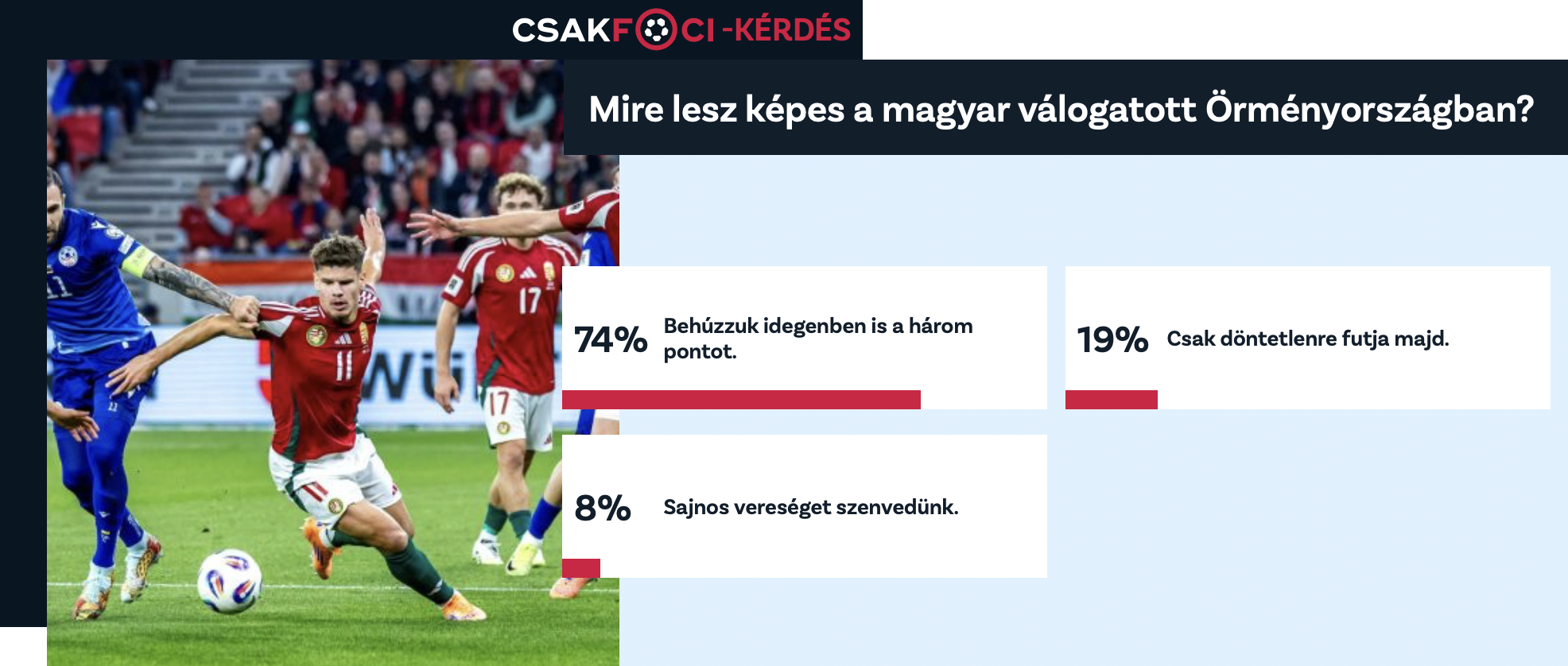 Rendkívül fontos vb-selejtezőt játszik a magyar válogatott csütörtökön 18.00-tól Örményországban. A találkozó apropóján természetesen a Csakfoci szavazós felületén is arra voltunk kíváncsiak, olvasóink szerint milyen eredményt érnek majd el a mieink Jerevánban.