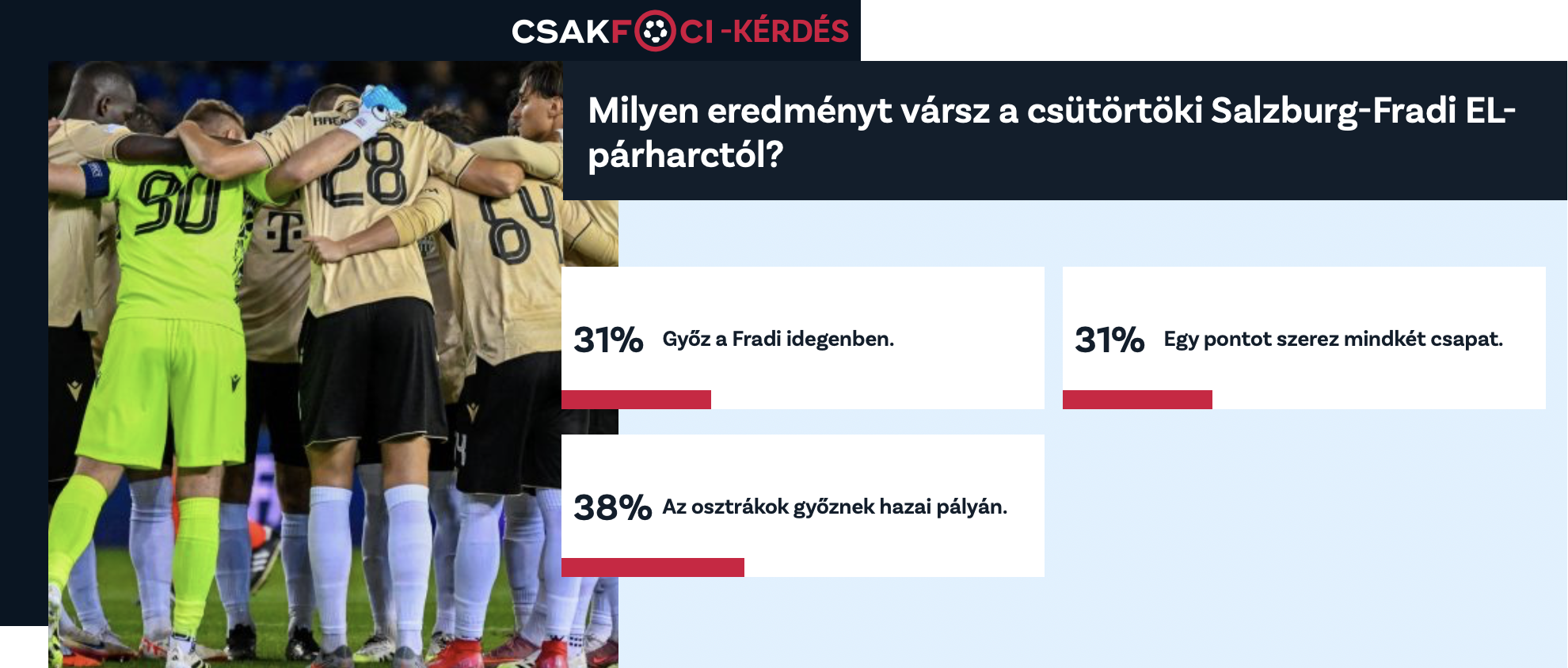 A legtöbben (38%) Salzburg-győzelmet várnak, de nagyon szorosan ott van mögötte a másik két eshetőség - ráadásul fej-fej mellett -, azaz hogy a Fradi tud majd egy pontot szerezni, illetve hogy zöld-fehér siker születik (31-31%).